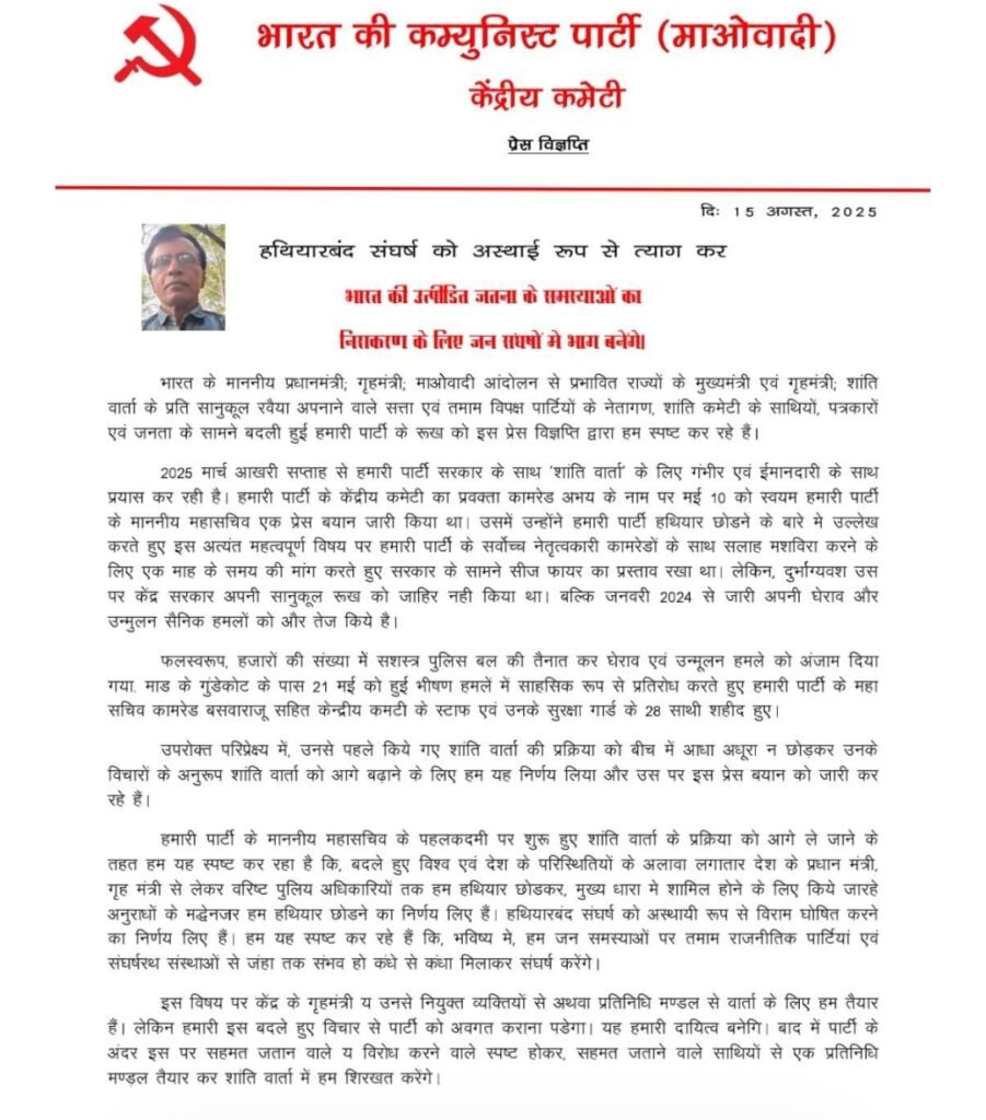 छत्तीसगढ़:– नक्सलियों के केंद्र कमेटी द्वारा जारी पर्चा खूब वायरल हो रहा है जिसमें नक्सलियों ने प्रधानमंत्री नरेंद्र मोदी, गृह मंत्री अमित शाह, मुख्यमंत्री विष्णुदेव साय, गृह मंत्री विजय शर्मा से अपील करते हुए कहा के नक्सली संघठन हत्यार छोड़ बातचीत के लिए तैयार है।