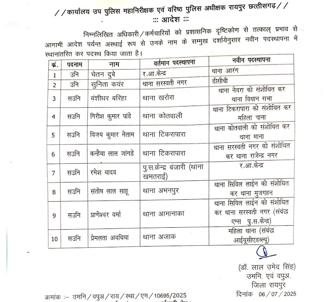 रायपुर:– राजधानी रायपुर के पुलिस विभाग में वर्षों से जमी मनमानी की जड़ आखिरकार उखड़ गई। खमतराई थाना में लंबे समय से पदस्थ ASI रमेश यादव को वरिष्ठ पुलिस अधीक्षक (SSP) लाल उम्मेद सिंह ने तत्काल प्रभाव से हटा दिया। ASI पर आरोप था कि वह कई वर्षों से एक ही थाने में जमे हुए थे और अपने आप को उच्च अधिकारियों से सीधा संपर्क वाला बताकर रौब गांठते थे।